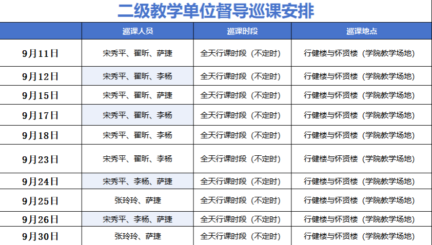 2.期间,学院督导专家跟随学校教务与评估中心开展了巡课活动,重点检查了“手机入袋”“课堂管理”与新生课程等,检查发现,多数教师能很好地执行学院关于行为养成与校园文明的相关要求,新生第一课均做了转达。任课教师能够按时到岗,教学准备充分;学生精神状态饱满,课堂参与度较高。校园环境整洁,个别教学设备运转不正常,如缺少话筒。